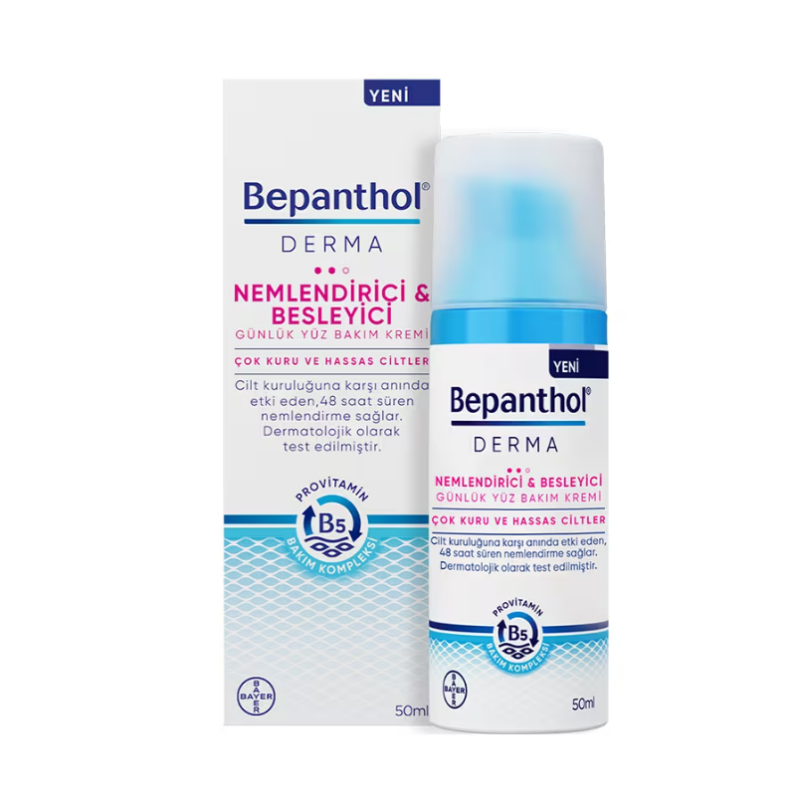 Bepanthol Derma Nemlendirici ve Besleyici Günlük Yüz Bakım Kremi cildin sahip olduğu bariyeri destekler. Kurudan çok kuruya dönük ve hassas ciltlere koruma sağlamak amacıyla geliştirilen, zengin ve su bazlı formülü, kuru ciltlere anında rahatlama sunar, kuruluğun kaynağına inerek cildi uzun süreli nemlendirir.